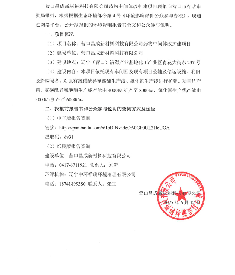 營(yíng)口昌成新材料科技有限公司藥物中間體改擴(kuò)建項(xiàng)目環(huán)境影響評(píng)價(jià)公示(報(bào)批前公示)